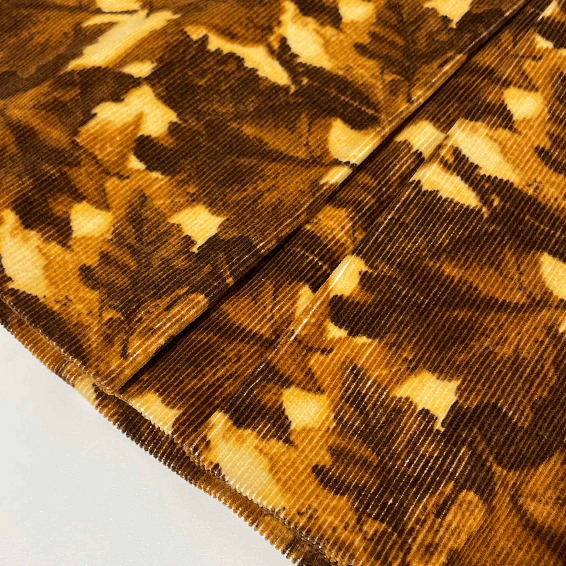 A beautifully crafted pleated midi skirt made in Italy, featuring a brown corduroy base with an all-over maple leaf print. A warm, textural piece with a soft structure that moves elegantly with wear.