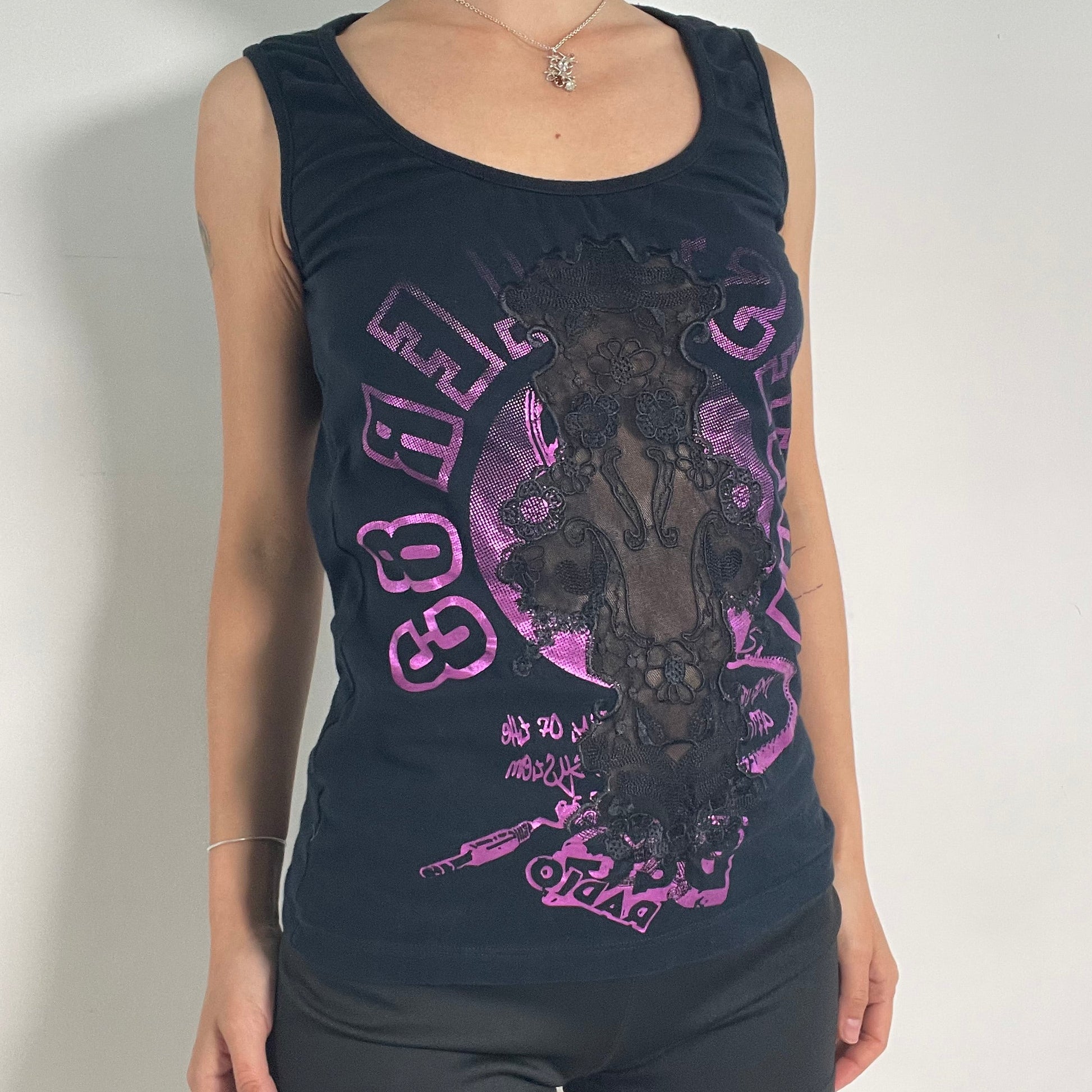 Pink graphic and black cross-shaped see through lace in the front