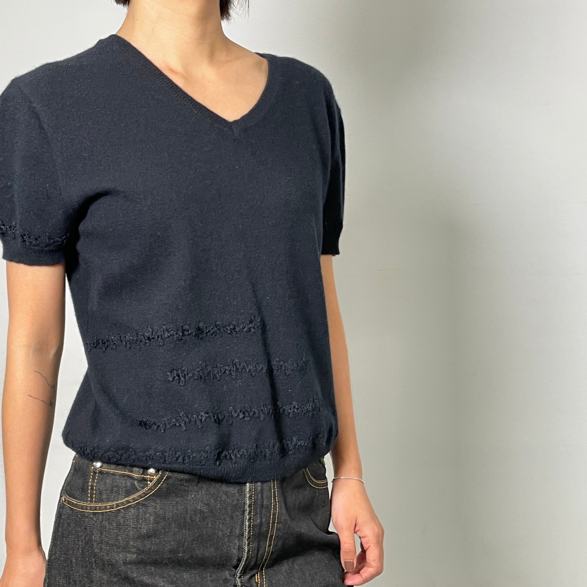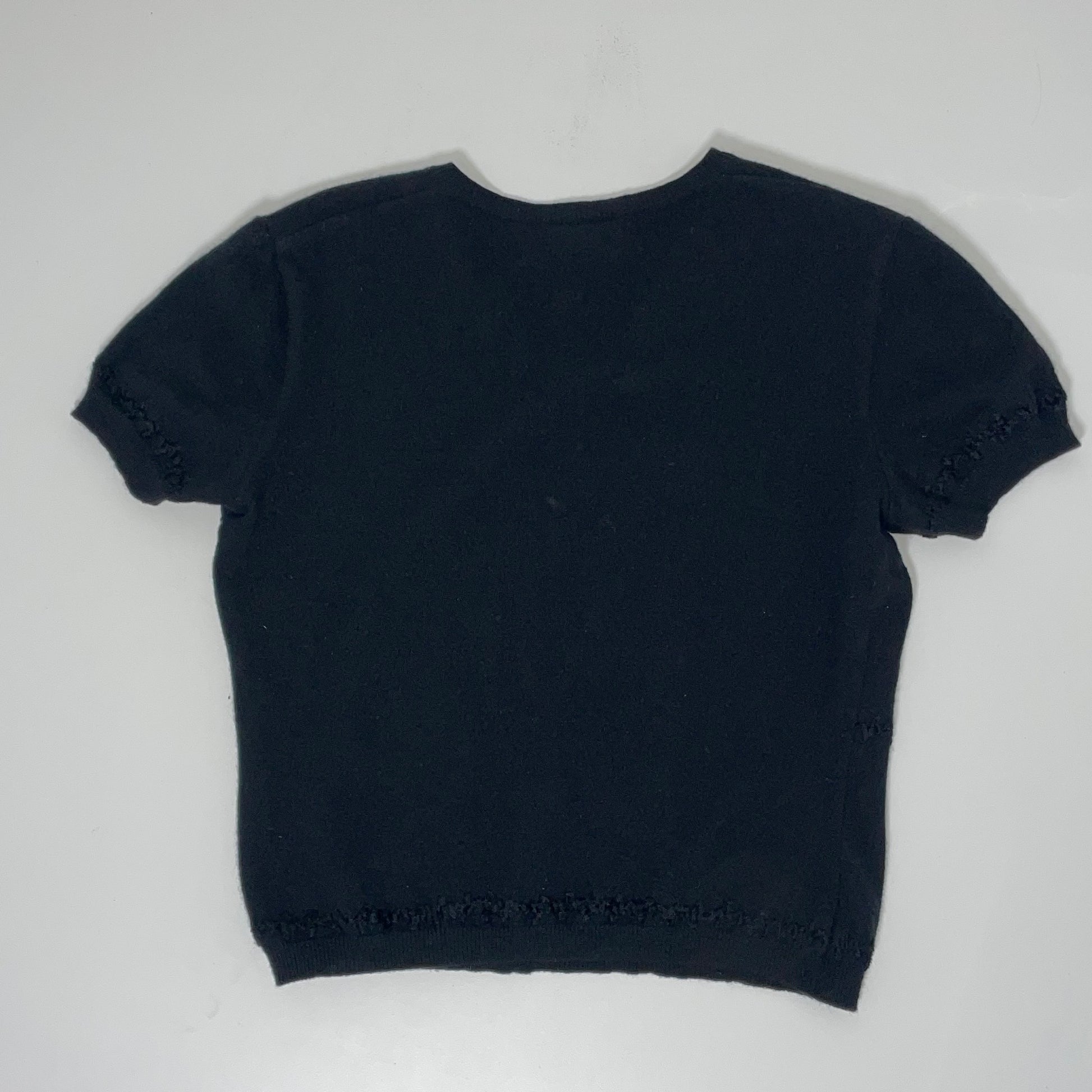A finely knitted short sleeve jumper in a deep navy tone, crafted in Italy. The fabric is exceptionally soft to the touch and is estimated to be 100% cashmere (no composition label present). A refined essential that can be styled as a lightweight knit or elevated t-shirt.